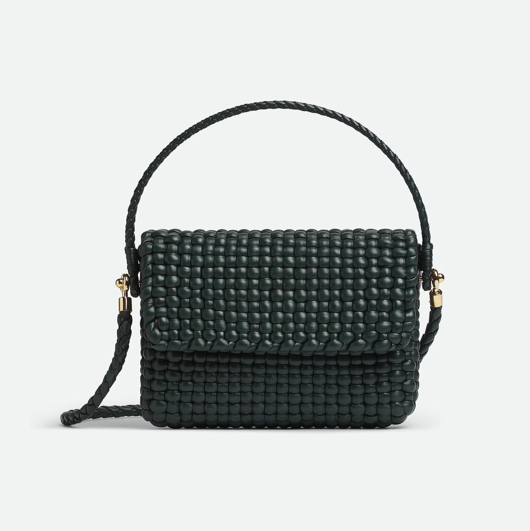 •인트레치오 위빙으로 완성한 스몰 탑 핸들 백 •두 줄의 중첩된 스트랩이 있음 •한 개의 내부 지퍼 플랫 포켓 •자석 잠금장치 •안감 없음 •브라스 하드웨어 마감