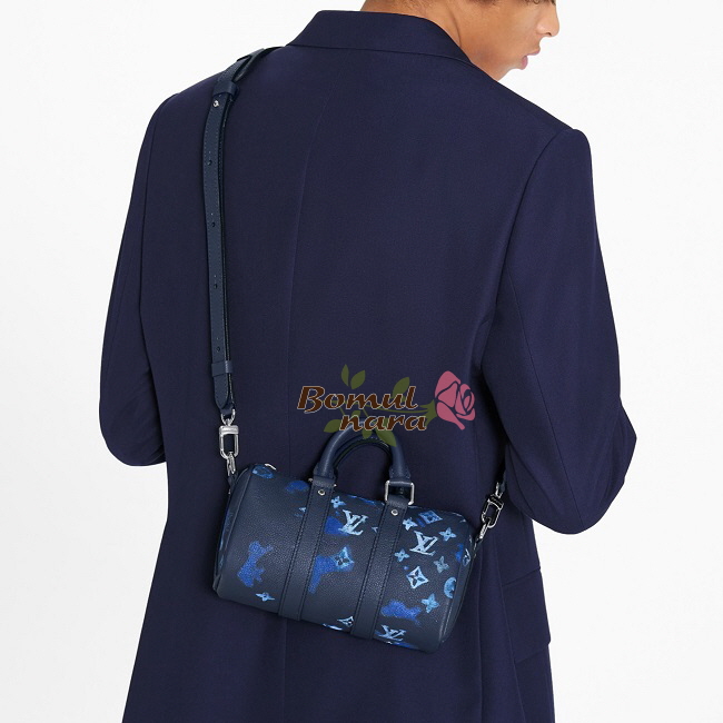 수채화로 그린듯한 모노그램 프린트가 장식된 네이비 블루색상의