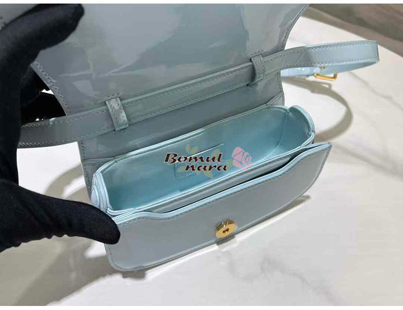 페일 블루 컬러의 페이턴트 송아지 가죽으로 제