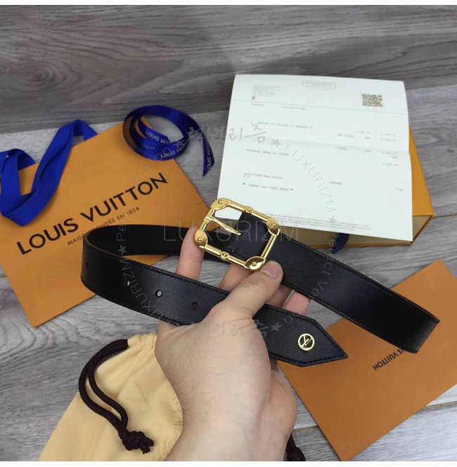 .플레인 송아지 가죽 골드 색상의 마감 브라스 유서 깊은 LV 트렁크를 오마주한 사각 버클과 모서리 디테일 금속 LV써클 엔드 피스.
