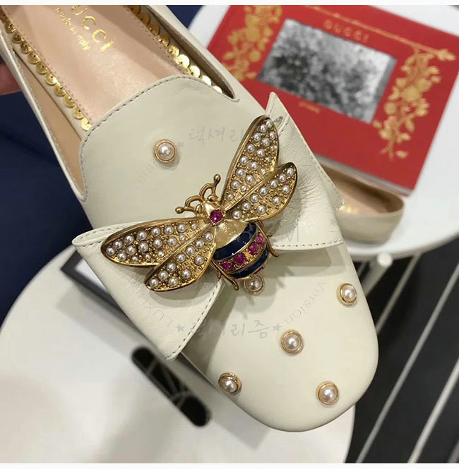 GUCCI-505291 9526 구찌 보우 디테일의 화이트 가죽 발레 플랫 여성용