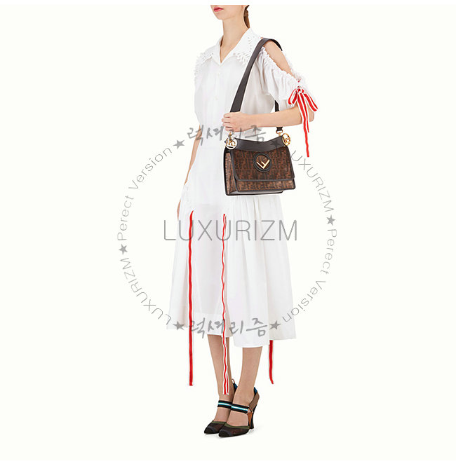 색조의 FF 로고 프린트. 톤온톤 가죽 피니싱. 팔라듐 및 골드 피니싱이 믹스된 메탈 장식.